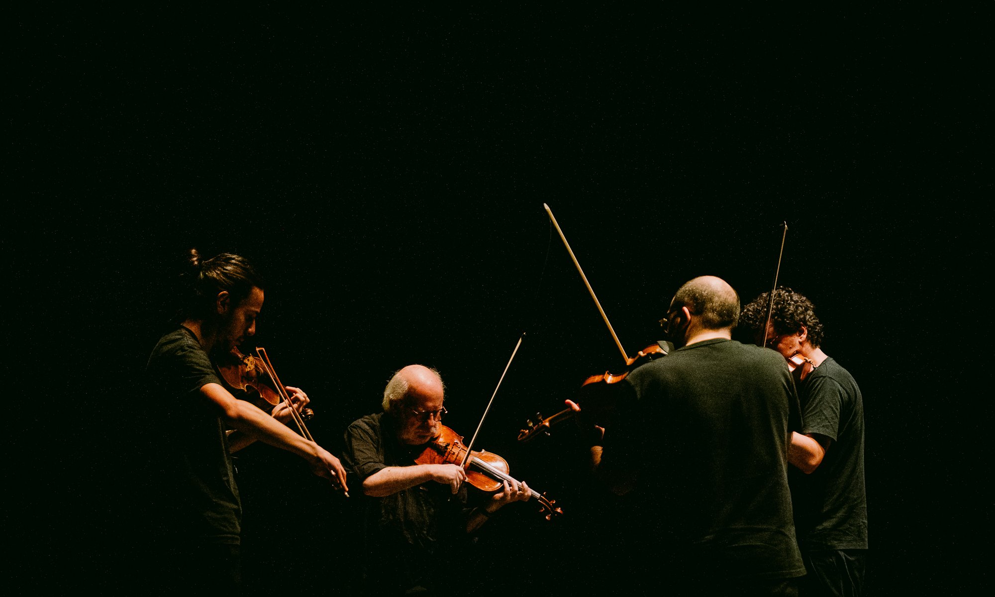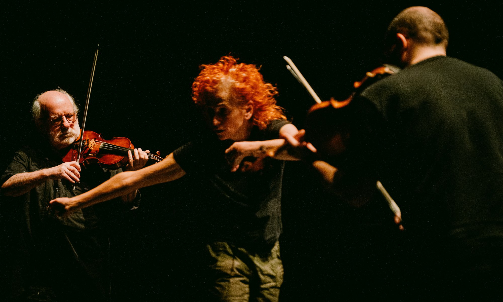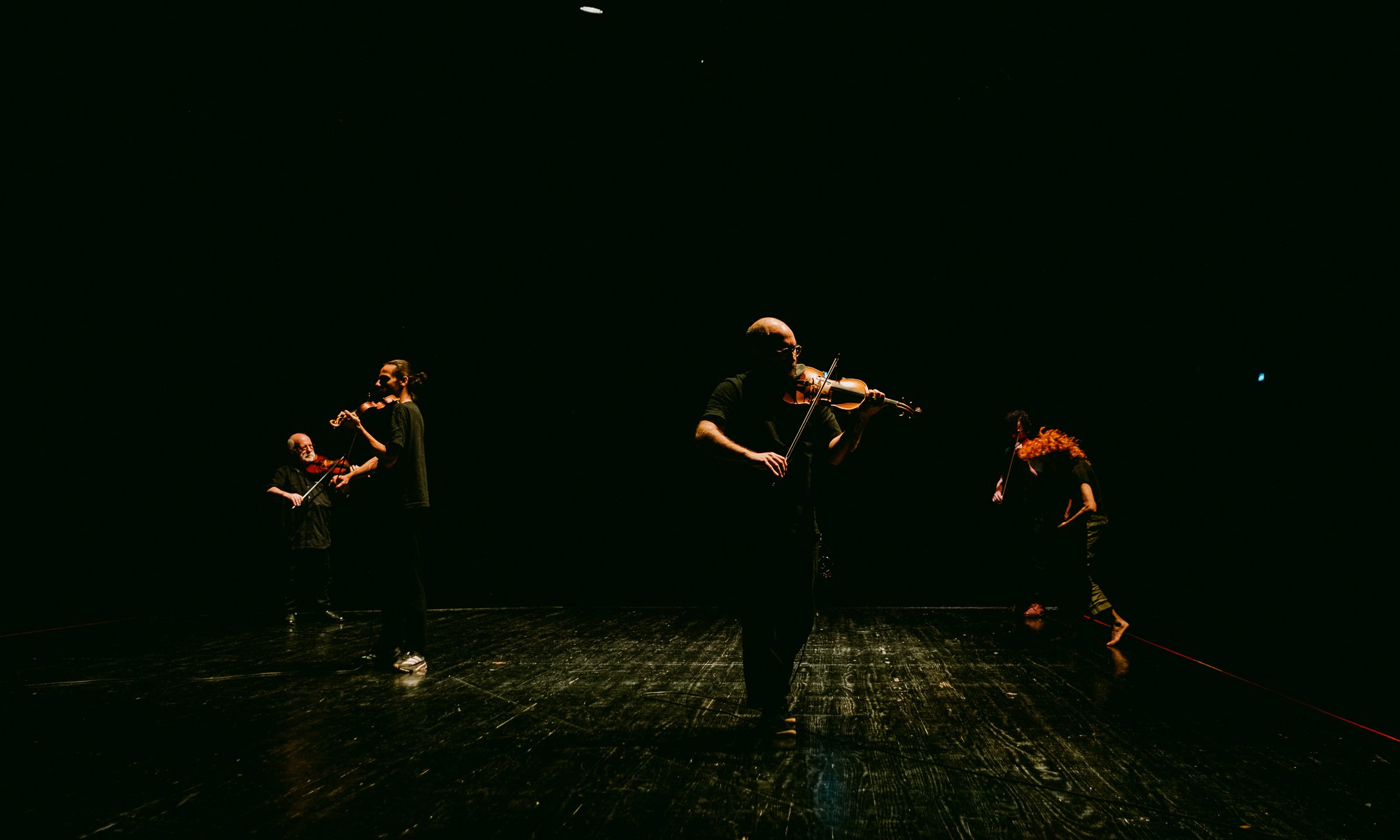 Since 2024, and especially during 2025, Hedera 4tet has established an innovative project in the field of sound creation, seeking to place its music in dialogue, activated by other artists and disciplines, bringing questions and results to the body of its compositions and, ultimately, to the very essence of the ensemble. Addressing the boundaries between influence, sharing, interpretation, and creation, the group invited artists from various fields to co-create with the quartet through their different practices. Pedro Carneiro, Gonçalo M. Tavares, and Pedro Calapez were names that provided building material: in this case, music, but also literature or visual arts as catalysts for an idea of live sound composition; contaminated and contaminating. In the final stretch of this enormous undertaking, the violins of Carlos Zíngaro, Bernardo Aguiar, David Magalhães Alves, and Francisco Lima da Silva are placed among the gestures of Vera Mantero — a choreographer and performer who has so skillfully used music and sound in her pieces — for two unique and truly unrepeatable takes, with music and movement in intrinsic creative dialogue.