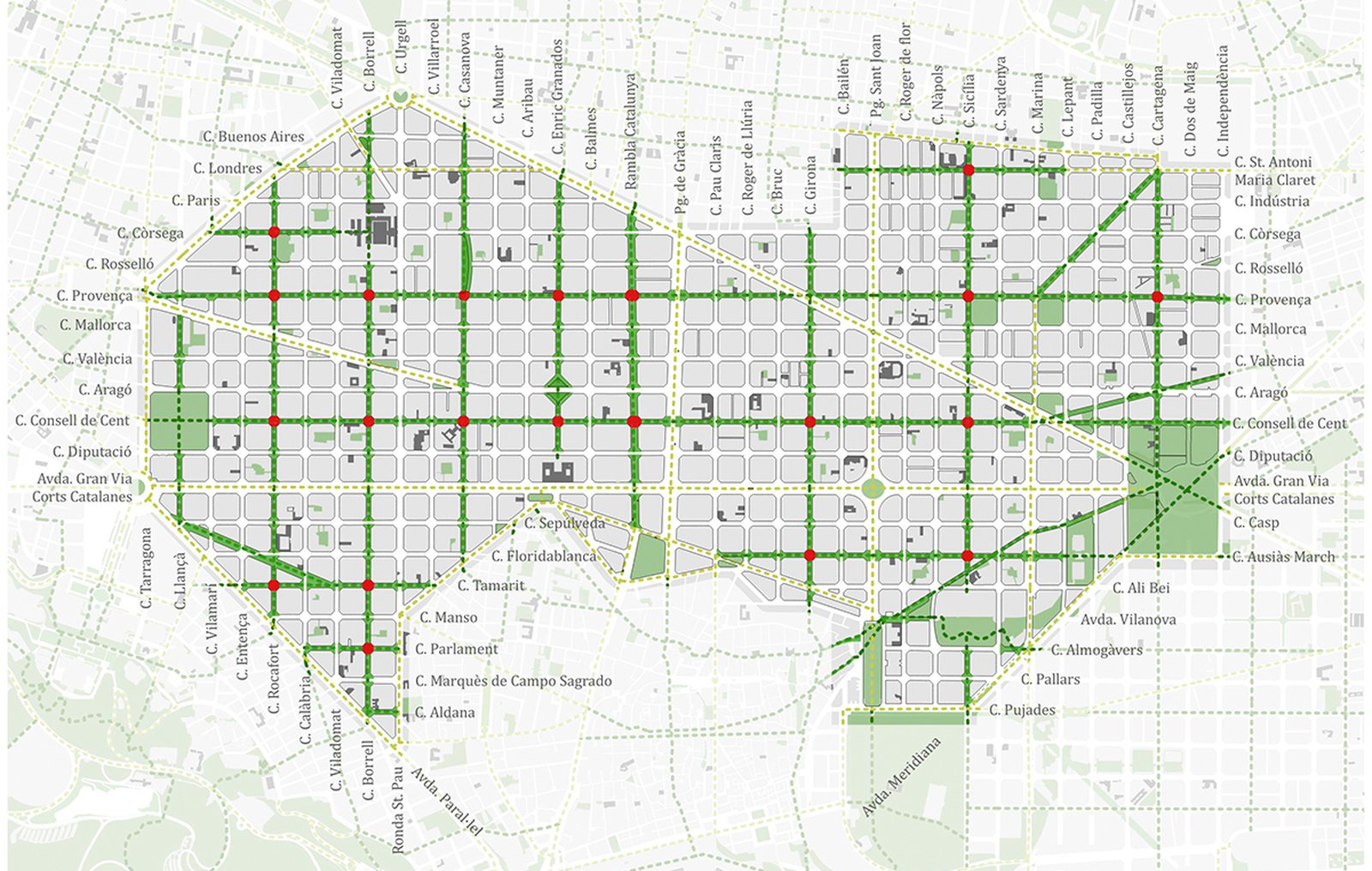 A proposta das Superilles procura reorganizar a mobilidade para reduzir o tráfego de veículos e criar uma rede de ruas verdes e novas praças. O objetivo principal é garantir que todos os moradores tenham uma praça ou rua verde a no máximo 200 metros de suas casas, ampliando significativamente os espaços de convivência, lazer e descanso, sobretudo na área central do distrito.